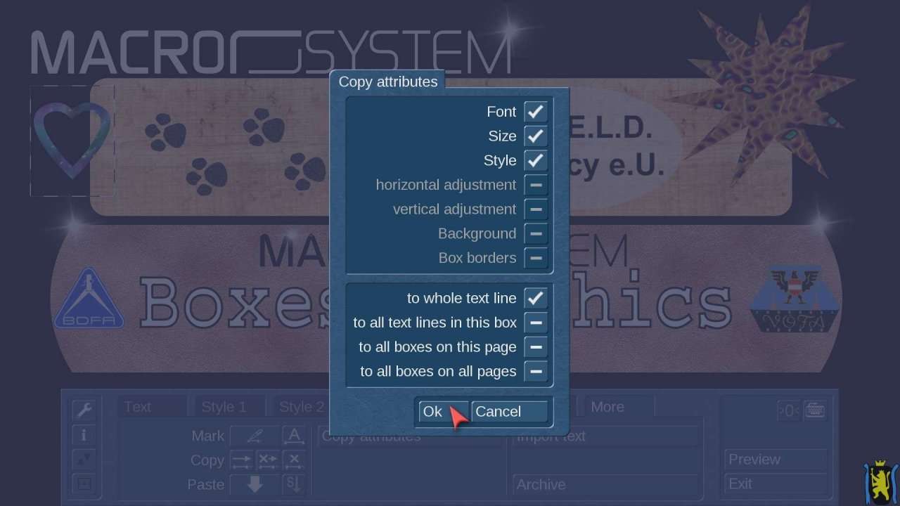 - Kopier-Funktion mit Bereichs-Unterstützung für reinen Text, Stil, Größen, Ausrichtungen, Hintergründe, Ränder, etc. auf Zeilen/Tafeln/Seiten, etc. für globale Änderungen in mehrseitigen Titel-Dokumenten