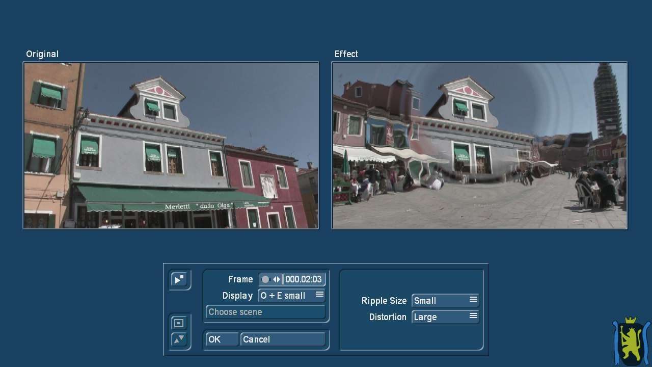 | ZI Welle 1 | Dieser Effekt lässt Wellen über die Szene gleiten. Dadurch entsteht der Eindruck, dass die Szene im Wasser gespiegelt wird. | Richtung, Zyklen, Wellengröße, Biegung |